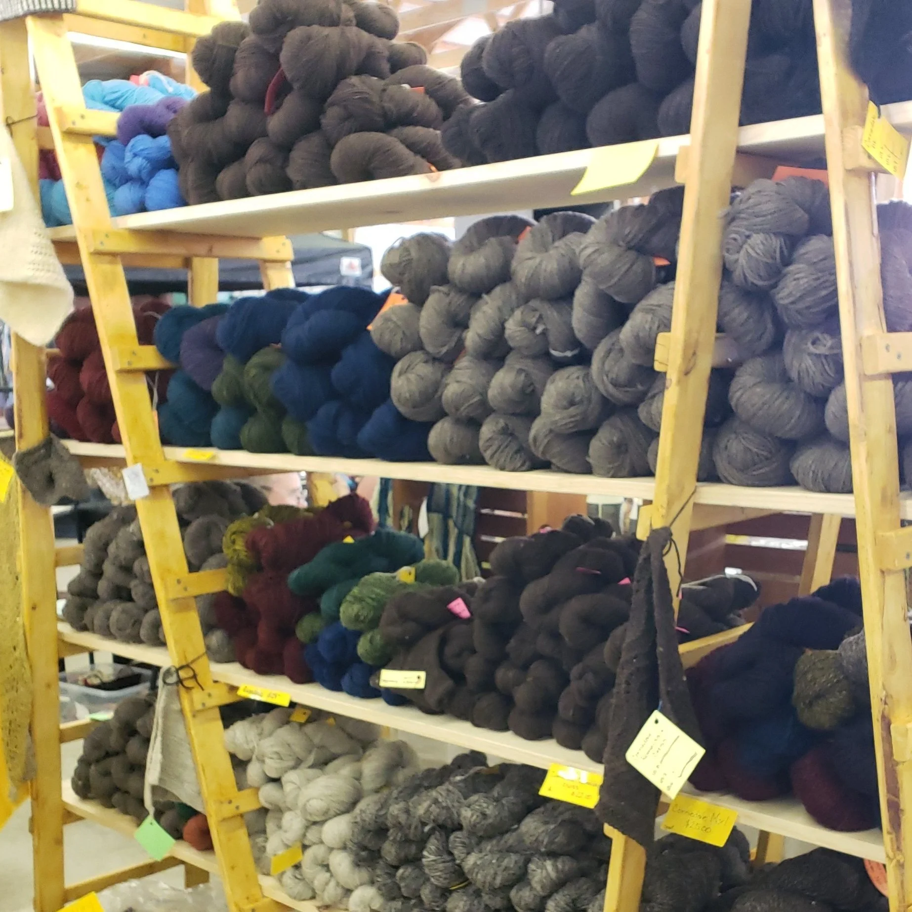 photo showing multi shelf display of single breed yarn at Great Lakes Fiber Festival